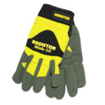 Guante mecánico anti vibración desarrollado en cuero sintético y spandex, palma con acolchado de poron y puño ajustable con velcro.